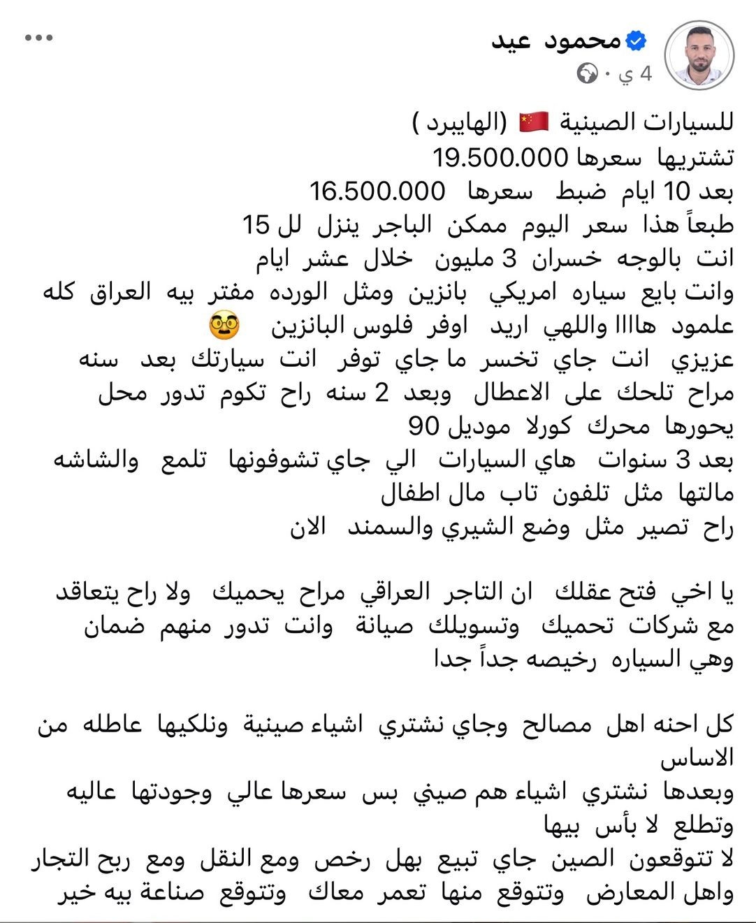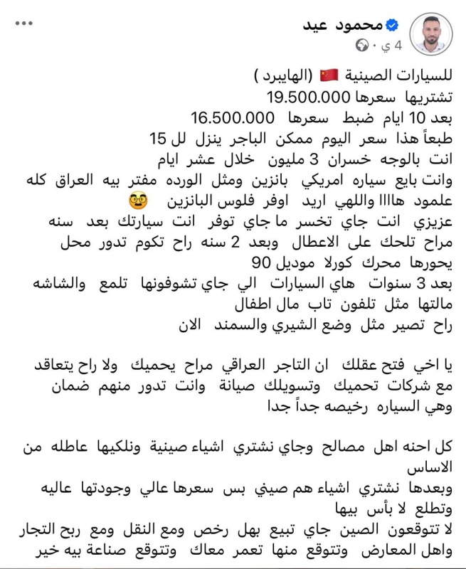 وحذّر عيد من الاعتماد على التجار لحماية المستهلك، "التاجر العراقي لا يحميك، ولا توجد شركات صيانة رسمية تدعم هذه السيارات، وأنت تتحمل المخاطر بالكامل. السيارات الصينية الرخيصة جداً لا تأتي مع ضمان طويل أو جودة عالية، فالسعر المنخفض غالباً لا يعني أن السيارة ستصمد أو توفر مصاريف الوقود كما يظن البعض".