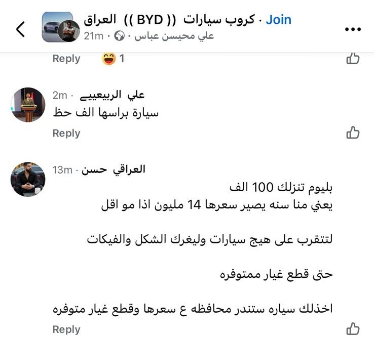 من جانبه، عبّر أحد الزبائن، في تعليق على صفحة وكالة السيارة، عن استيائه من أداء الوكالة المحلية لشركة BYD، قائلاً، إن "الوكالة تعاني من ضعف في خدماتها، فعدد الموديلات المتوفرة محدود جدًا، ومعظمها يأتي من دون المواصفات التي تجعل السيارات الصينية مرغوبة لدى المستهلكين في الأصل".
