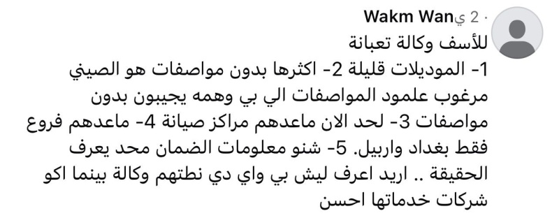 وأضاف، أن "الوكالة حتى الآن لا تمتلك مراكز صيانة معتمدة في أغلب المحافظات، إذ تقتصر فروعها على بغداد وأربيل فقط، كما لا توجد معلومات واضحة عن شروط الضمان أو مدته، وهو ما يثير قلق المشترين ويضعف الثقة بالمنتج".